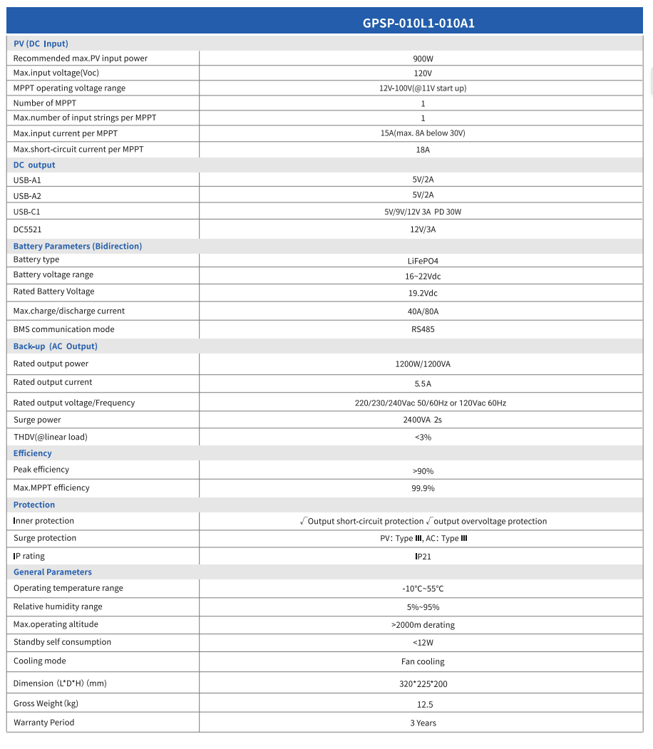 Gospower 1200W portable household energy storage system is an integrated all-in-one device designed for mobile energy demands. 1200W rated power, maximal 900W PV input and 960Wh capacity make it suitable for your daily requirements, such as a 750W generator, 1200W incandescent bulbs and 735W air conditioner etc.