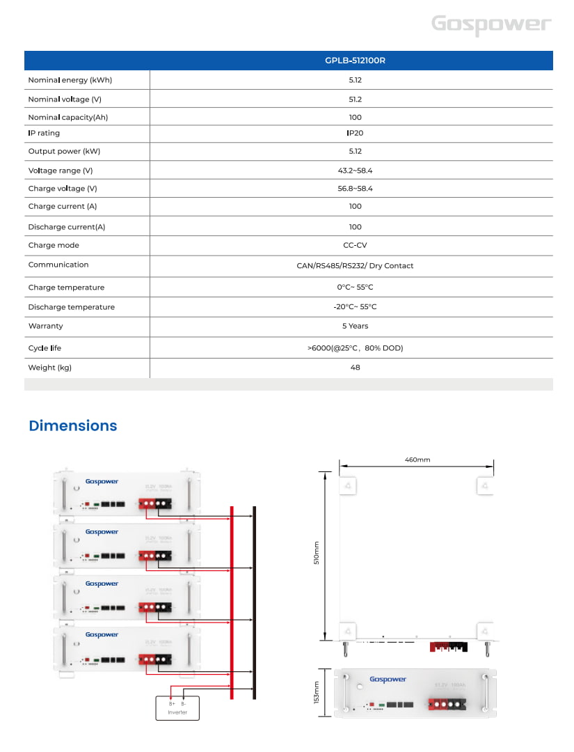 Gospower GPLB-512100R rack mounted lithium battery is suitable for both off-grid and hybird inverters with high compatible protocol matching. Simple and elegant appearance design makes it more profitable.