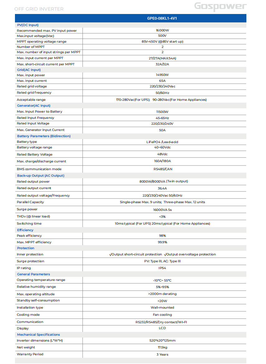 The Gospower GPE0-08KL1-4V1 pure sine wave solar inverter integrates with built-in BMS communication, the inverter enables seamless monitoring and management of battery performance. Capable of parallel operation with up to 12 units, it offers scalability to meet growing energy demands. Backed by 3-year warranty, users can trust in its durability and longevity.
