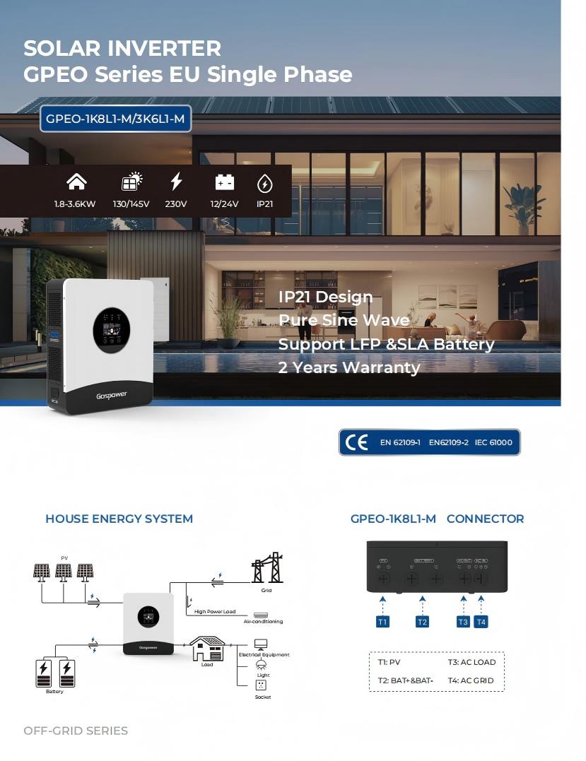 Single Phase Solar Inverter is a pure sine wave solar inverter specially developed by Gospower for residential users. The series adopts the technology of combining high frequency isolation with solar inverter, integrating multiple protection functions and supporting intelligent monitoring system, which is widely used in areas without power or unstable power supply, providing efficient, flexible, safe and reliable solutions.