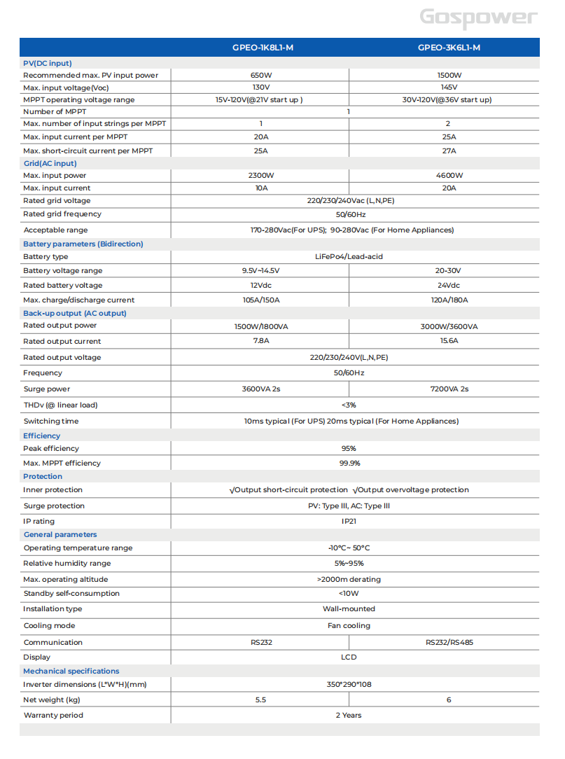 Gospower GPEO-1K8L1-M Solar Inverter with 20A MPPT solar charge controller is perfect for off-grid, backup power supply and self-consumption applications for homes and small businesses, it is a pure sine wave, hybrid solar inverter system with 50Hz/60Hz frequency, providing power for every need.